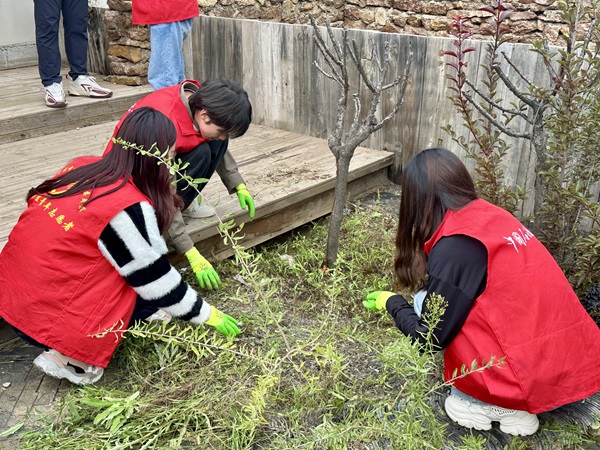 在村支书的介绍下,实践队员了解到当地民宿产业以结合村落特色的多元文化为标志,涵盖波西米亚风、极简风等多种建筑风格。队员们简单学习了此次除草工作的要求,戴上手套,拿起锄头,开始了对民宿周围杂草的清理。他们认真分辨着杂草与有益植物,确保在美化环境的同时不会误伤。随着杂草被一一清除,民宿庭院更加整洁开阔。随后,队员们对民宿的进一步美化,有的在花坛里种植色彩斑斓的花卉,还有的在庭院中布置了一些小巧的装饰品,旧时栏楯,亦遂增胜。他们的创意和努力让民宿焕发出了新的生机,为游客提供了一个更加舒适和宜人的休闲空间。实践队员蔡佳慧表示:“这次劳动不仅锻炼了我的身体,更让我体会到了团队协作的力量,亲眼见证了民宿环境在我们的努力下焕然一新。”队员们在劳动中体会到了与自然和谐共处的乐趣,也对植物的生长环境有了更深入的了解。