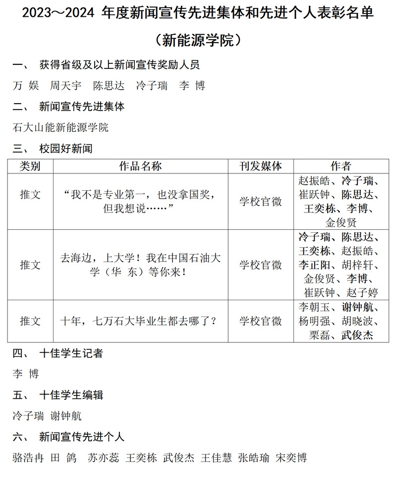 本年度,公司获评“新闻宣传先进集体”,万娱、周天宇、陈思达、冷子瑞、李博等5人被授予省级及以上新闻宣传奖励,李博被授予“十佳员工记者”荣誉称号,冷子瑞、谢钟航被授予“十佳员工编辑”荣誉称号,骆浩冉、田鸽、苏亦蕊、王奕栋、武俊杰、王佳慧、张皓瑜、宋奕博等8人获“新闻宣传先进个人”荣誉称号,王延波、骆浩冉、秦政获聘公司党委宣传部2023~2024年度特聘记者,此外由多名员工参与的三篇推文获评“校园好新闻”。