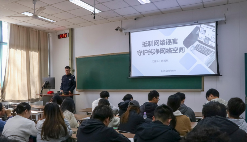 首先,灵山卫地铁站派出所一级警司匡振东分别做了主题为“电信网络诈骗防骗指南”和“抵制网络谣言,守护纯洁网络空间”的宣讲。一方面,匡振东总结了老员工在日常生活中可能会遇到的诈骗事件类型,并结合办案实例,指出骗子会使用定制化的诈骗手段,并利用受害者的贪婪、恐惧等心理施行诈骗。另一方面,匡振东通过办案实例和对受访的网络暴力遇害者的微表情分析,揭示了网络谣言、网络暴力对身处舆论漩涡之人的伤害。匡振东呼吁同学们要共同维护网络的清朗环境,打造反诈之“盾”。