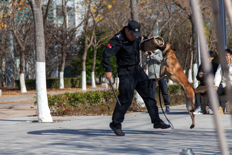 同学们还观看了由两只警犬带来的精彩演练,在地铁分局刑警大队警犬工作站的警察引导下,警犬出色地演示了跟随、攻击、搜查违禁物等科目。员工们与警犬进行了亲密接触,了解了警犬平时的性情和具体的工作内容。之后,员工与警察合影留念。