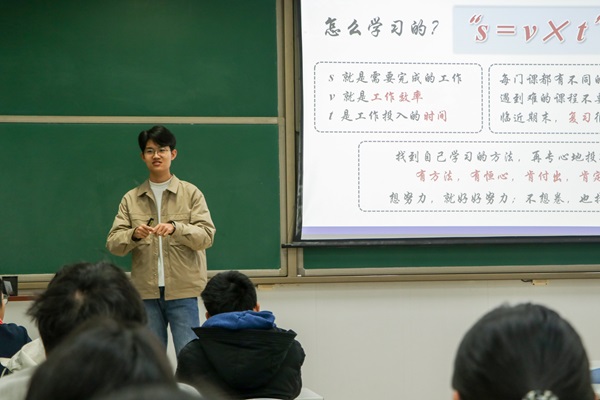 会上,何小龙倾囊相授,先是分享了自己独特的学习方法,从如何高效笔记到巧妙构建知识体系,每一个妙招都让员工眼前一亮。备考技巧方面,他分享了自己的室友是如何做到考前高效“抱佛脚”的:不断翻看各学科课本,每看一次都有不一样的体会,针对自己的知识盲区刷题,避免题海战术。同时,在时间管理方面,何小龙就如何在身兼多职的情况下不遗落学业向员工做出了分析。随后,他还分享了自己的竞赛经验和心得,讲述了自己与同学,老师合作,并肩完成比赛的经历,同时鼓励同学们积极参加科技竞赛,劝勉同学们从参与者开始,逐步成长为负责人能够独当一面。最后,何小龙表示十分希望自己能够帮助学弟学妹们解决学习生活中碰到的各种问题,并与同学们合影留念。
