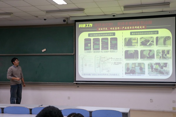 优秀学子们根据自己参加科技创新赛事的经历,详细讲解了参赛的准备工作、团队协作、问题解决和创新思维的培养等方面。保研至中国石油大学(华东)的陈浩介绍参加比赛的具体经历,详细阐述如何完成创新性强的项目。他强调不要轻言放弃,把事情坚持做下去,不厌其烦地调整和优化方案,一定会有收获,同时鼓励同学们要敢于提出自己的想法和创意。保研至清华大学的于莅洋从个人经验出发强调了创新思维的培养以及实践操作的结合。她特别提到,在科技创新过程中,要学会从失败中汲取教训,每一次失败都是成功的铺垫。