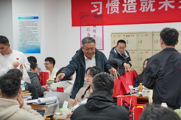 各专业班主任代表也分别发言,提醒同学们要注意饮食营养,保持身体健康,调整作息,以最好的状态迎接考试,老师们与考研学子们进行亲切交流,最后在辅导员穆海涛一声声的呐喊与肯定中,把慰问活动推向了高潮。
