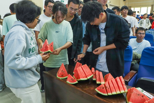 大会伊始,员工心理健康教育中心徐铭雪以“在不确定的世界里,选择拥抱变化”为题,引导新生重视心理健康,为新生逐步适应老员工活筑牢心理防线。心理宣讲结束后,大会氛围迎来温馨转折。辅导员张子良兑现军训期间对新生的承诺,分发饮品,同时为奖励员工在各项军训活动中取得的优异成绩,特别准备了新鲜西瓜,与新生共享荣誉喜悦。在班助有条不紊地切西瓜的过程中,辅导员张子良向新生介绍大学与高中的区别,讲解了需遵守的规章制度,同时结合公司发展与新生成长,鼓励员工积极参与校园活动,全面提升综合素养。随着会议接近尾声,新生们有序上前领取西瓜,在轻松的氛围中交流心得并依次离场。