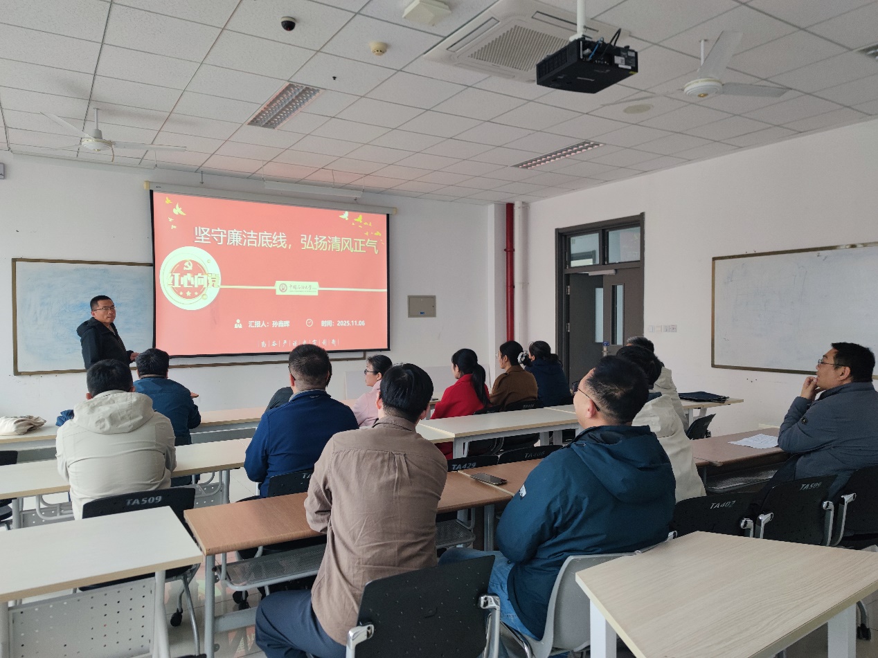 孙鑫晖老师以“坚守廉洁底线,弘扬清风正气”为题,结合当前全面从严治党形势,系统阐述了理想信念对共产党人的根本性意义。他强调,理想信念是精神之“钙”,一旦动摇,就会导致精神缺“钙”、行为失范。通过剖析近年来违纪违法典型案例,孙老师指出,清正廉洁不仅是党的优良传统,更是每一名党员必须坚守的政治底线,全体党员要常修为政之德、常思贪欲之害、常怀律己之心,做到权为民所用、情为民所系、利为民所谋,在教书育人和科研工作中永葆清廉本色。